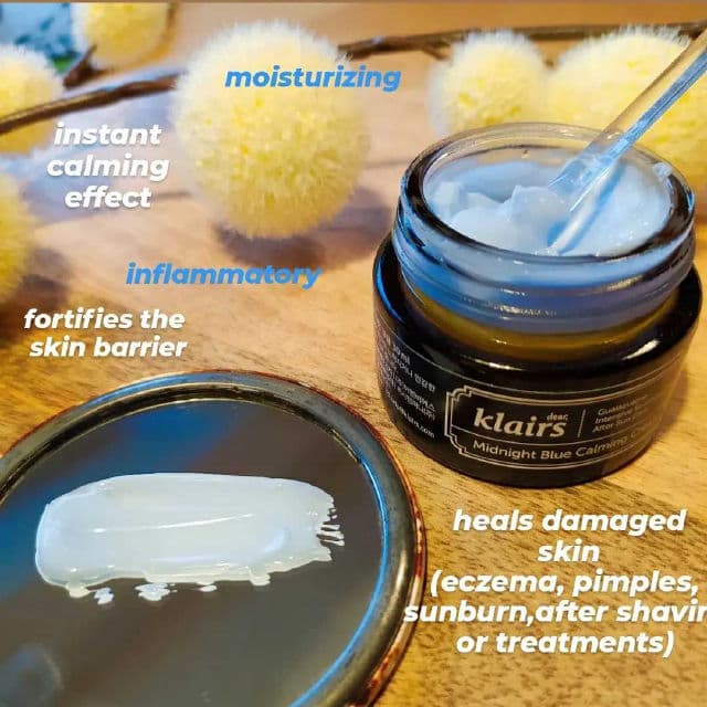 💙 REVIEW 💙 of the famous @klairs.global 𝙈𝙞𝙙𝙣𝙞𝙜𝙝𝙩 𝙗𝙡𝙪𝙚 𝙘𝙖𝙡𝙢𝙞𝙣𝙜 𝙘𝙧𝙚𝙖𝙢 I received this product for free from @go.picky @pickyrewards @klairs.global in exchange for my honest review!!! Thank you so much!!! LADIES AND GENTLEMEN.... 💙 I proudly present the review of my all-time favorite barrier cream! I've discovered this cream many many years ago, when my passion for Asian beauty started. During this time I dealed a lot with eczema in my face and some rosacea around my nose and it did wonders!!! If you search for an INSTANT calming effect for example because of skin inflammations or having overtreated your skin ( Retinol or exfoliants) or if your skin got sunburned or irritated after shaving.... In every single case this cream will fix it 🥰💙 Highly recommend this HG to EVERYBODY!!!! 𝙒𝙝𝙖𝙩 𝙙𝙤𝙚𝙨 𝙞𝙩 𝙢𝙖𝙠𝙚 𝙨𝙤 𝙢𝙖𝙜𝙞𝙘𝙖𝙡? 🔹guaiazulene ( anti inflammatory chamomile oil which gives the cream the blue colour, healing) 🔹centella extract ( soothing) 🔹ceramides ( skin barrier protection) 🔹peptides ( skin strenghtening, antiaging) 🔹Argan oil, jojoba oil ( nourishing) The texture is also so smooth and moisturizing ( enough for my combo skin... ) and it is free of any irritants like fragrance or alcohol Just love it