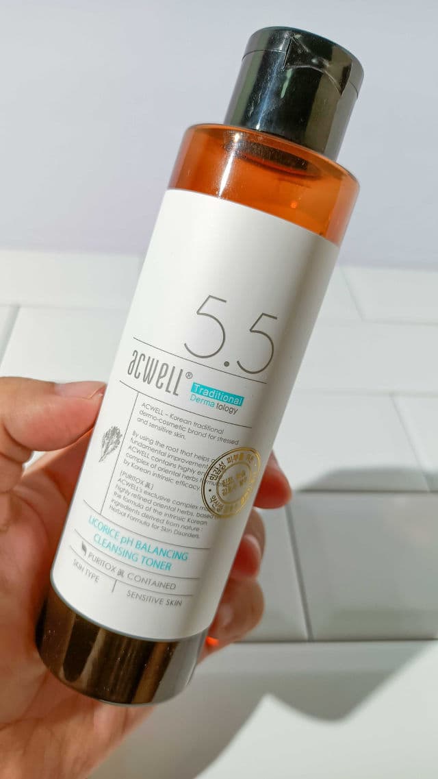 This toner comes in a transparent brown plastic bottle and white label with a flip top shaped cap. This indicates that this product is packaged hygienically and safely. The toner has a liquid texture similar to water, so it absorbs well into the skin and doesn't feel sticky at all. It has a brown color because it contains 10% licorice root water and isn't made from artificial coloring. It also has a refreshing herbal citrus scent. This aroma comes from the extract of natural ingredients contained in it. The key ingredients used in Acwell's products are Puritox Jin which consists of licorice roots, peony roots, kudzu roots, and cimicifuga roots.