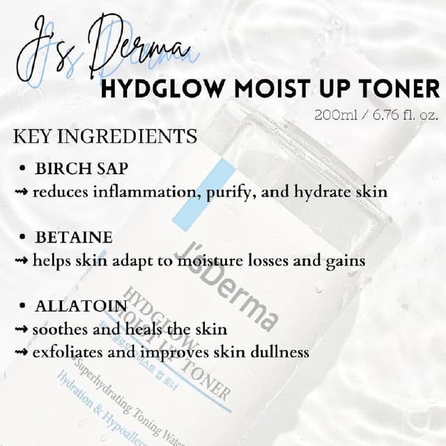 it claims to be a hypoallergenic hydrating toner that helps prep a supple complexion with reducing inflammation as well as moisturizing properties of birch sap and hyaluronic acid complex. my skin does feel a little bit hydrated but not as much as what i have expected.