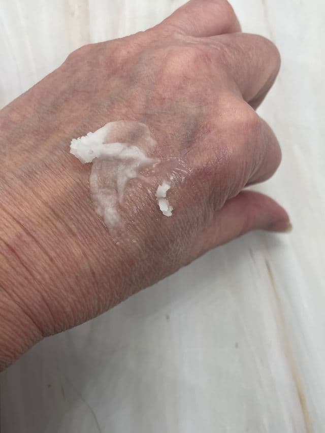 I take a scoop, and apply to my skin and massage it in. As it warms up in your hands, it changes to an oil texture, then emulsifies into a cream with water. It washes off easily and is gentle on skin. I don’t know how it works for removing eye makeup because I wear contacts and use a separate lip & eye makeup remover, but it doesn’t irritate or burn if I accidentally get it into my eyes.