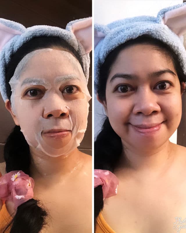 Short mask time of 10-15 minutes due to the material; enough leftover essence in the pack to cover neck, arms and legs.